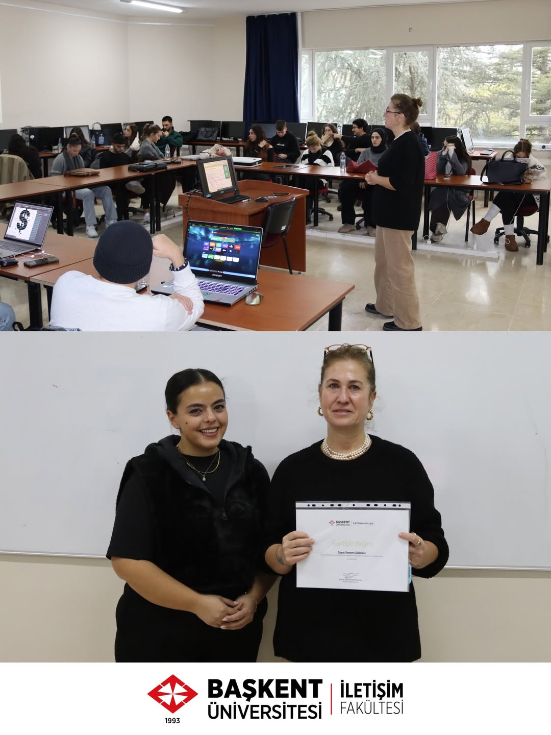 Fakültemiz öğrencilerine Erasmus+ Programı’nın başvuru ve süreç adımlarının aktarıldığı Erasmus Bilgilendirme Toplantısı, 9 Aralık Salı günü C110’da gerçekleştirildi. Toplantıda sunum yapan Uluslararası İlişkiler ve Değişim Programları Koordinatörlüğü’nden Senem Güdenler’e Fakültemiz Erasmus Koordinatörü Doç. Banu Erşanlı Taş teşekkür belgesi takdim etti.